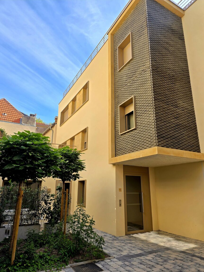 Résidence EDEN, construction de logement haut de gamme au centre-ville de METZ Réalisation des menuiseries extérieures aluminium bicolore hautement isolée avec des grands coulissants et des encadrements en tube aluminium teinte identique menuiserie.